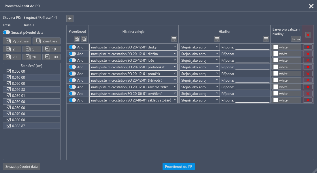 Funkce promítne entity v aktuálním výkrese nebo XREFu do zobrazení pracovních řezů jako křivky. Promítnutí není dynamické. Po jakékoli úpravě stop, zobrazení PR nebo entit je potřeba funkci spustit znovu.