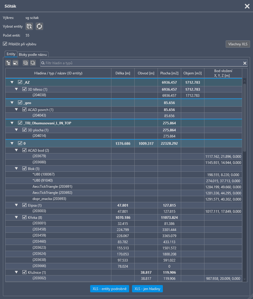 Dialog je plovoucí a lze použít i po překliknutí do jiného výkresu. Součty v dialogu na hladinách jsou vždy přes všechny typy entit.