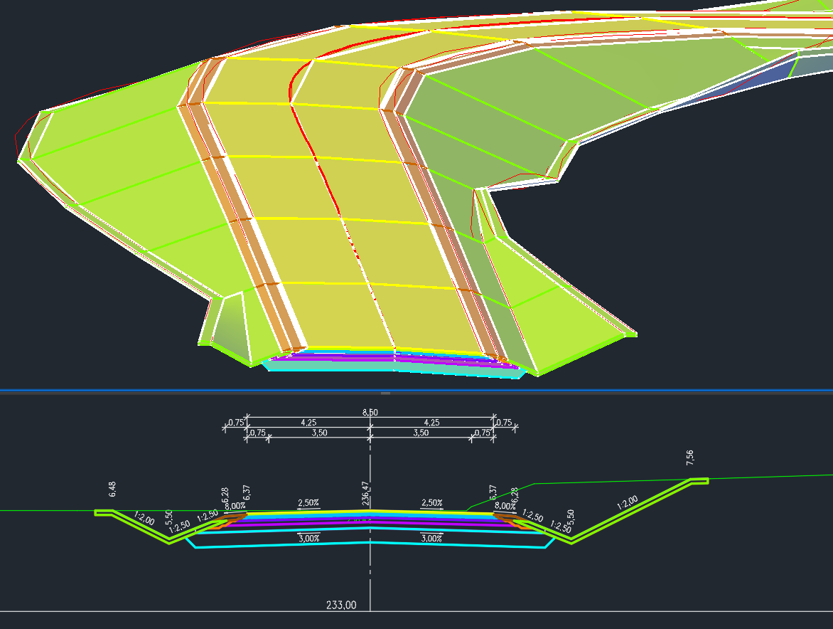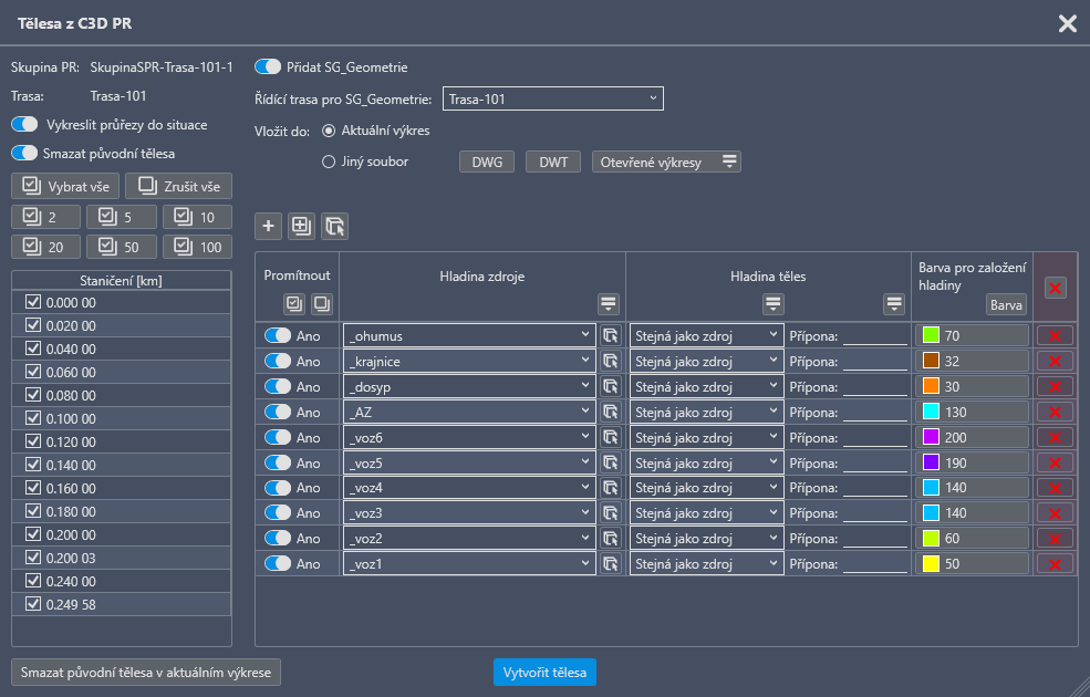 Vyberou se staničení, mezi kterými se mají tělesa vytvořit. Pokud je mezi staničeními mezera, tělesa jsou v tomto místě rozdělena. Z výkresu se vyberou hladiny, podle kterých se obrysy seskupí. Funkce následně vyhledá křivky v okolí C3D PR, seřadí podle odsazení od osy a spojuje první křivku v prvním staničení s první křivkou ve druhém staničení. Když je tedy více křivek v jednom PR, spojují se první s prvním, druhý s druhým, atd.