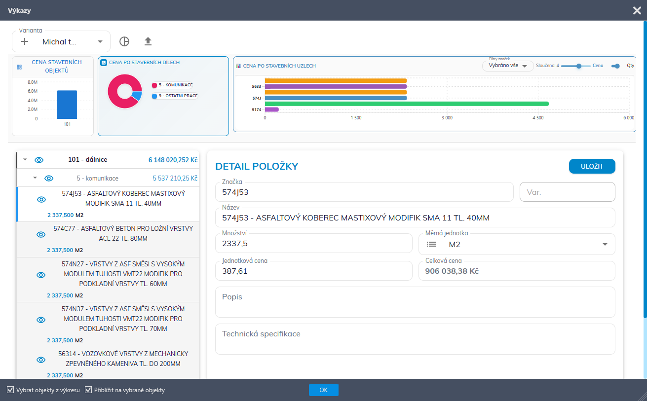 Po výběru varianty se zobrazí rozpočet, který je možné exportovat nebo si u něj zobrazit cenový a objemový rozpad. V dialogu je možné vybrat entity a zobrazit ve výkrese.